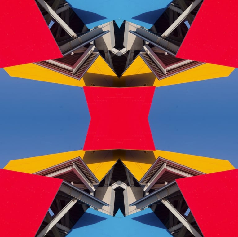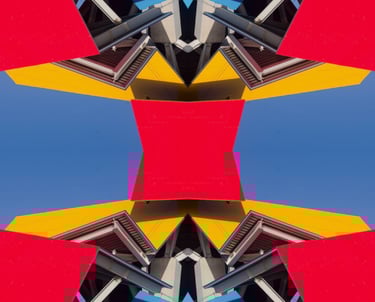 Multiverso Arquitectónico nace del archivo fotográfico documental de edificios diseñados por los grandes arquitectos del siglo XX y XXI — el Guggenheim, el Biomuseo, las obras de Gaudí. A través de la superposición y reinterpretación de esas imágenes, cada pieza propone un universo paralelo donde la forma arquitectónica se convierte en materia abstracta, vibrante y nueva. Una exploración de lo que existe entre el registro y la interpretación, entre la estructura y el sueño.